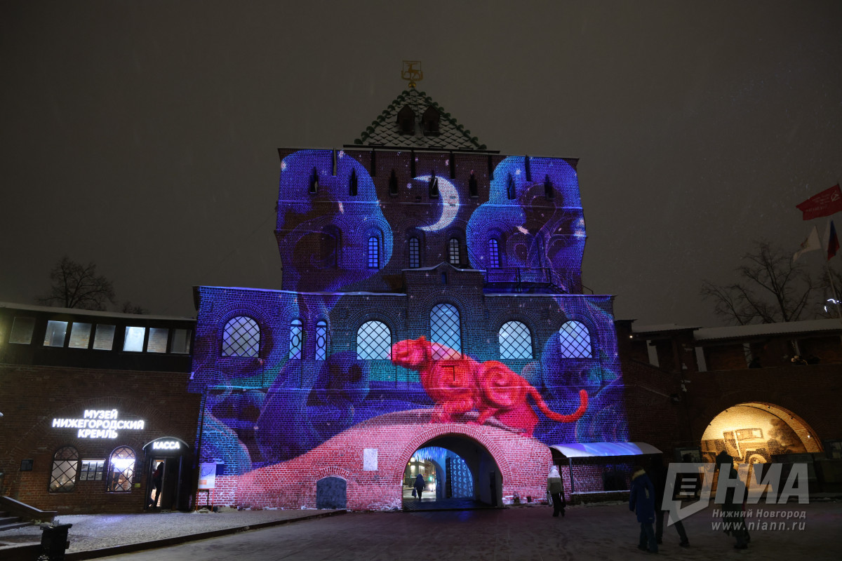Уже несколько дней на Дмитриевской башне Нижегородского кремля показывают праздничное мэппинг-шоу (0+).