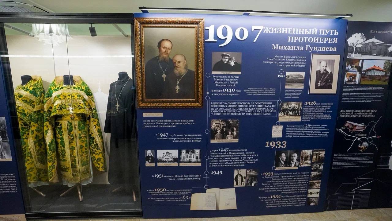 Экспозиция состоит из двух частей. Первая посвящена роду Гундяевых — предкам патриарха Кирилла, жившим в Нижегородской области. В нее вошли материалы из Музея русского патриаршества в Арзамасе и дома-музея "Исповедник веры Христовой — иерей Василий Гундяев" в Лукоянове. Среди экспонатов — личные вещи, документы, фотографии, церковное облачение, а также свидетельства о ссылках и заключениях.