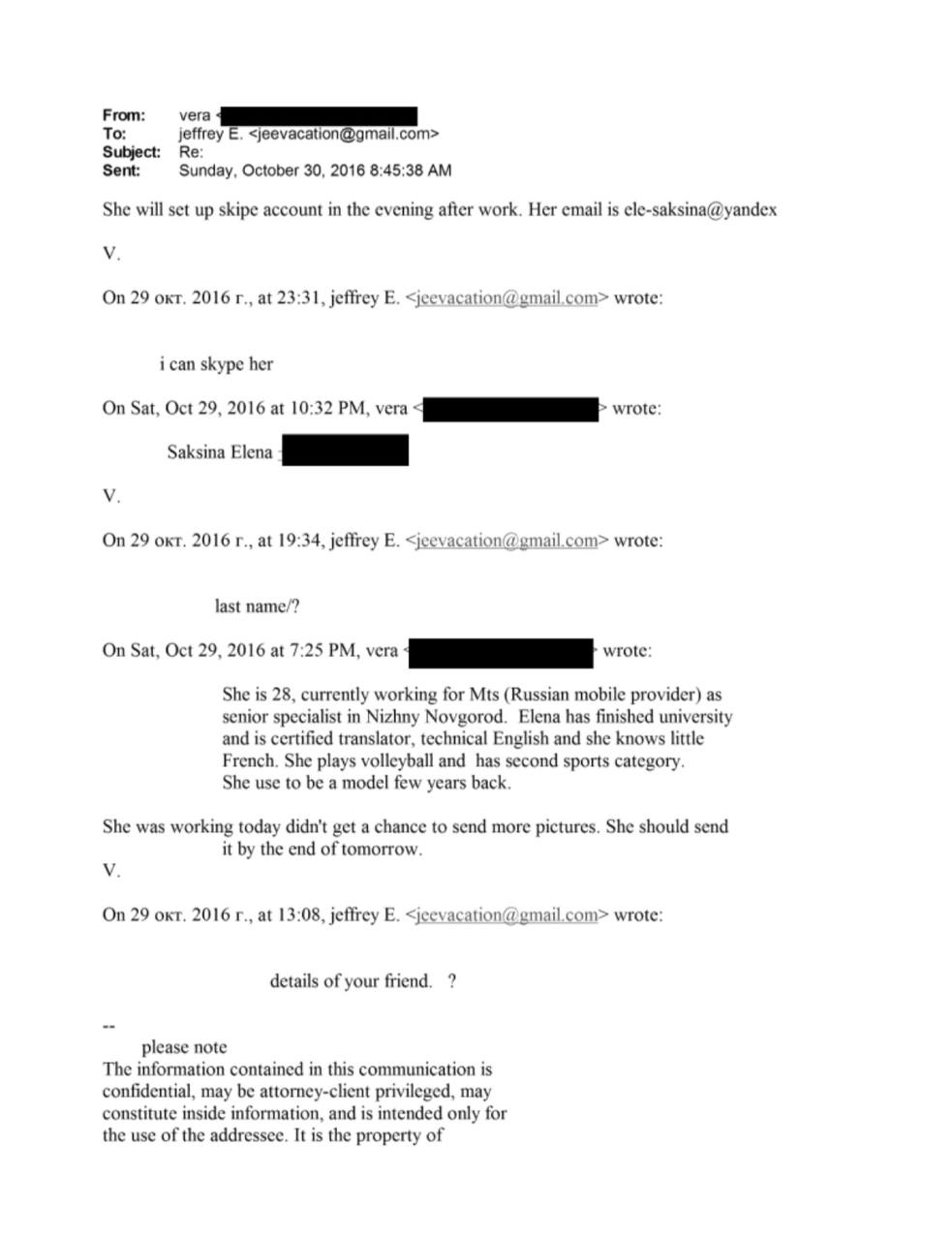 Согласно опубликованным документам, в октябре 2016 года некая женщина по имени Вера представила Эпштейну 28-летнюю Елену. В переписке сообщалось, что она окончила университет, имеет диплом переводчика, владеет английским и немного французским, играет в волейбол и ранее работала моделью. На тот момент она уже была старшим специалистом в компании мобильной связи в Нижнем Новгороде.