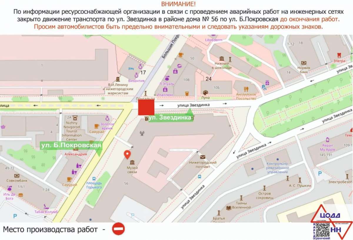 В Нижнем Новгороде введены ограничения на проезд по улице Звездинка. Движение закрыто в районе дома № 56 по улице Большая Покровская.