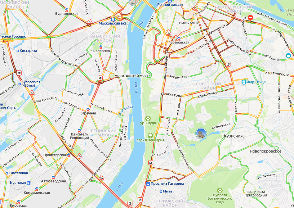 Движение затруднено практически во всех районах города. Центр Нижнего Новгорода весь окрасился в красный.