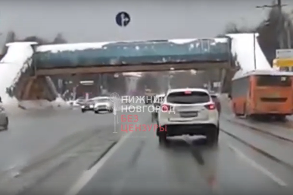 На проспекте Гагарина с надземного пешеходного перехода сорвался крупный пласт снега и упал прямо на проезжавший внизу автомобиль. Об этом сообщает телеграм-канал "Нижний Новгород. Без цензуры".