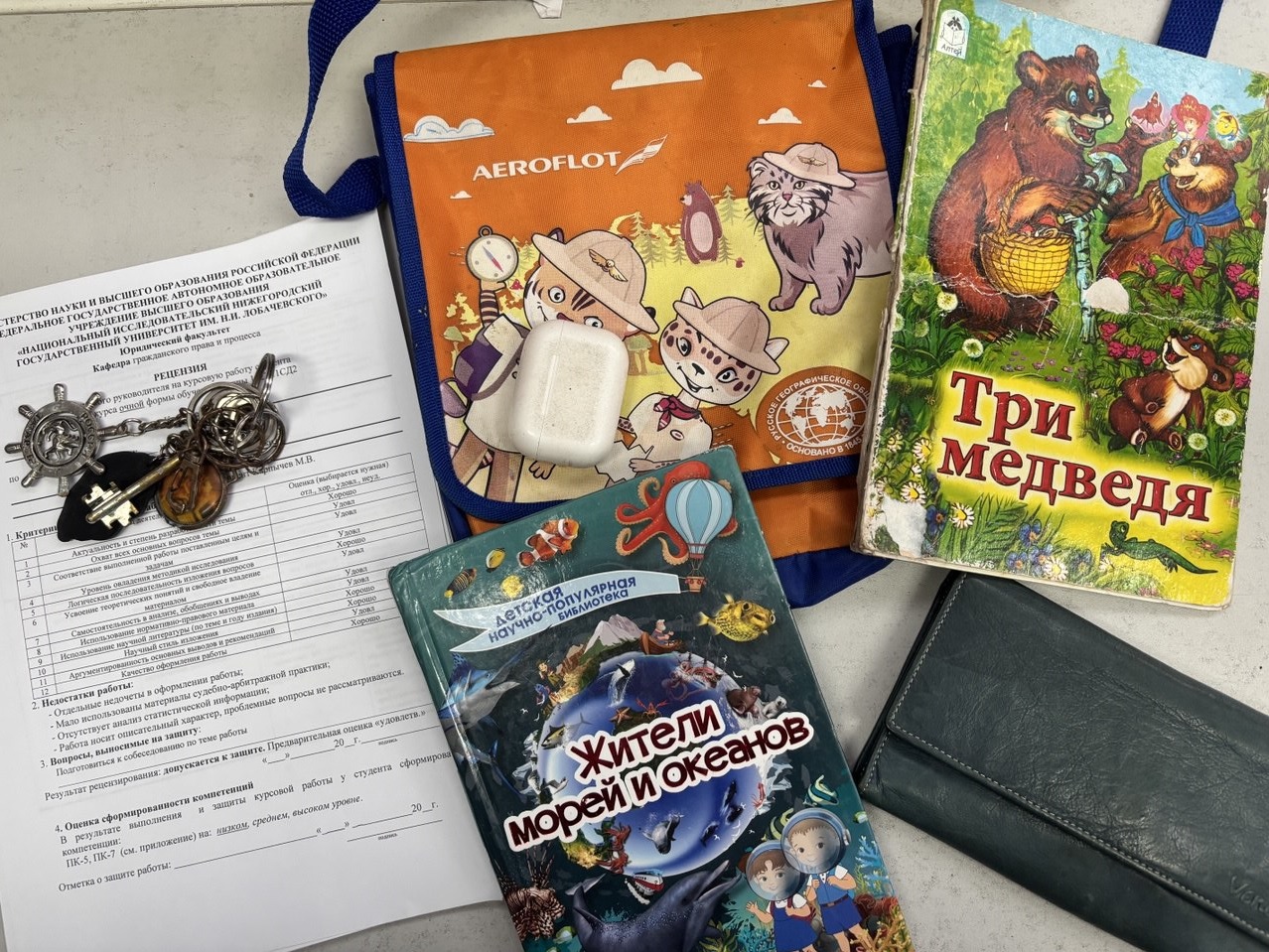 Но встречаются и более необычные находки. Среди них — рецензия на курсовую работу, сумка с детскими книгами, наушники, сувениры и одежда.