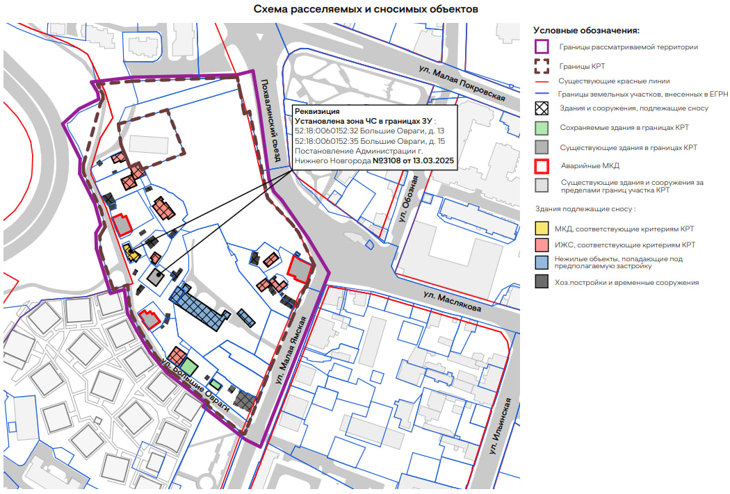 В документации приведен перечень объектов капитального строительства, расположенных в границах территории. Всего под снос предусмотрено 14 жилых домов, при этом два из них уже демонтированы — дом №11 на улице Малая Ямская и дом №9 на улице Большие Овраги.