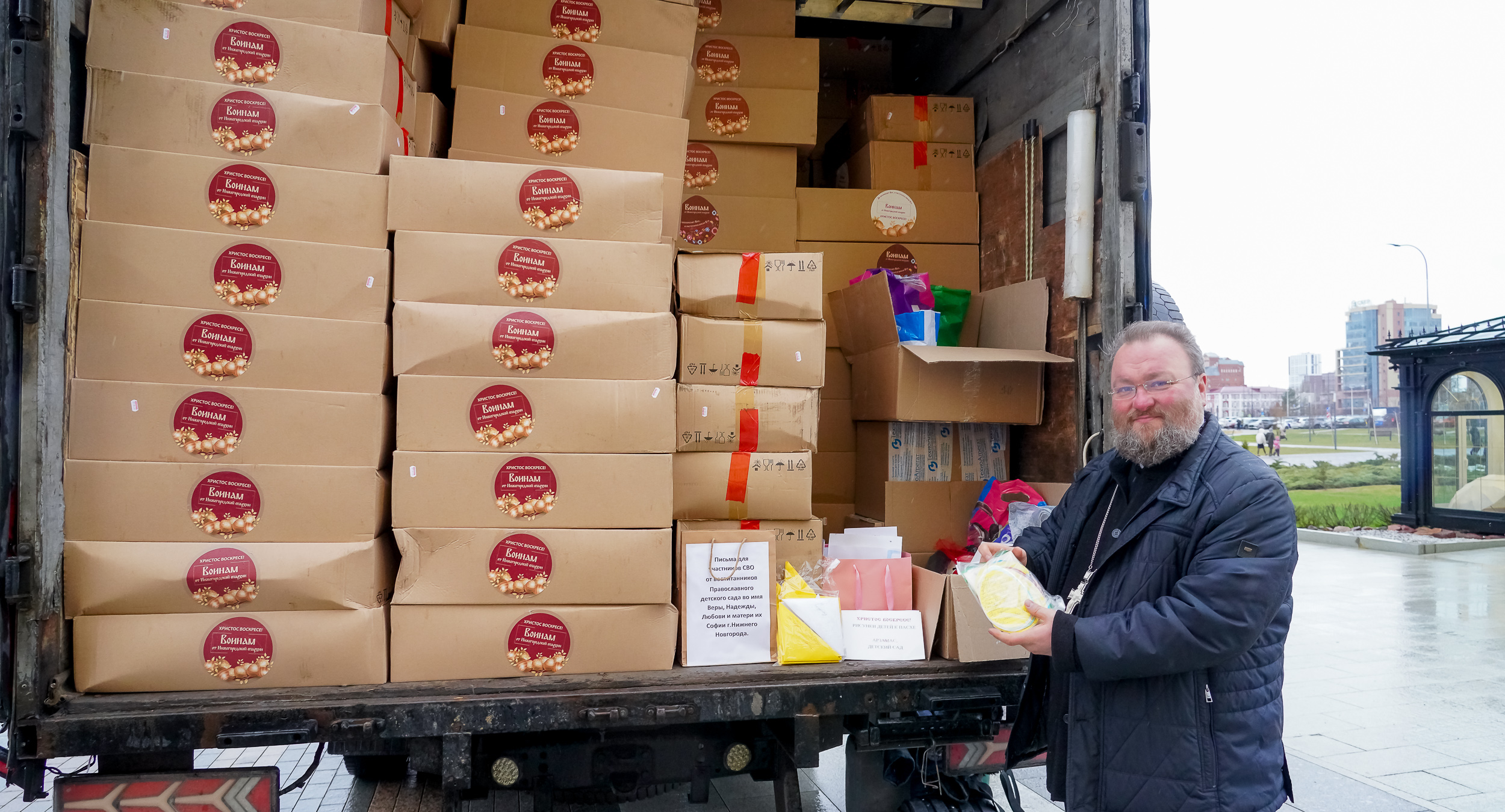Перед освящением митрополит Георгий обратился к собравшимся. Он отметил, что куличи и пасхальные поздравления направляются "от всей Нижегородской земли", добавив, что жители региона переживают за военнослужащих, молятся за них и ждут их возвращения.