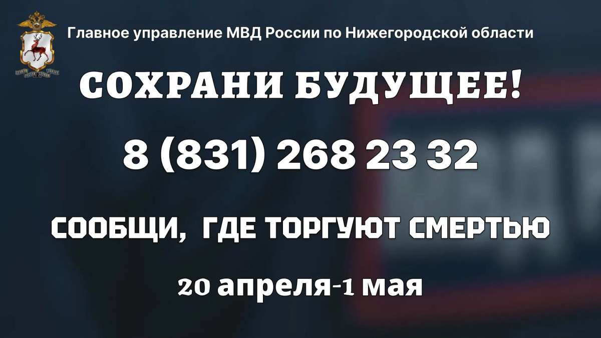 В Нижегородской области с 20 апреля по 1 мая 2026 года будет проходить первый этап общероссийской акции «Сообщи, где торгуют смертью». Цель акции - привлечение общественности к участию в противодействии незаконному обороту наркотиков, получение значимой информации, оказание квалифицированной помощи и консультаций по вопросам лечения и реабилитации наркозависимых лиц.