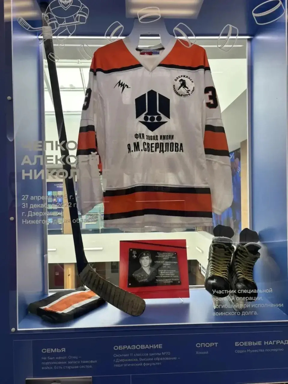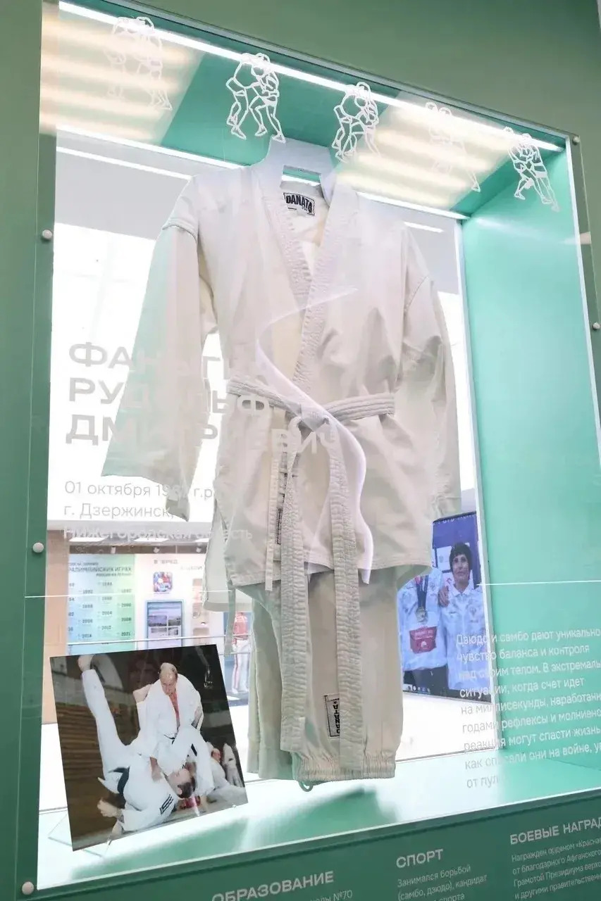 Рудольф Фаныгин, участник афганской войны, был снайпером и кандидатом в мастера спорта по дзюдо и самбо – он ушел воевать, чтобы отомстить за убитого друга. Ветеран чеченской войны Вадим Ладыгин всю жизнь занимался боксом и сейчас тренирует ребят в дзержинской школе бокса «Победа», его боксерские перчатки тоже стали частью экспозиции. На стенде, посвященном Великой Отечественной войне, представлена футбольная форма советского времени, которая принадлежала Григорию Григорьеву – директору заводского стадиона, ушедшему на фронт.