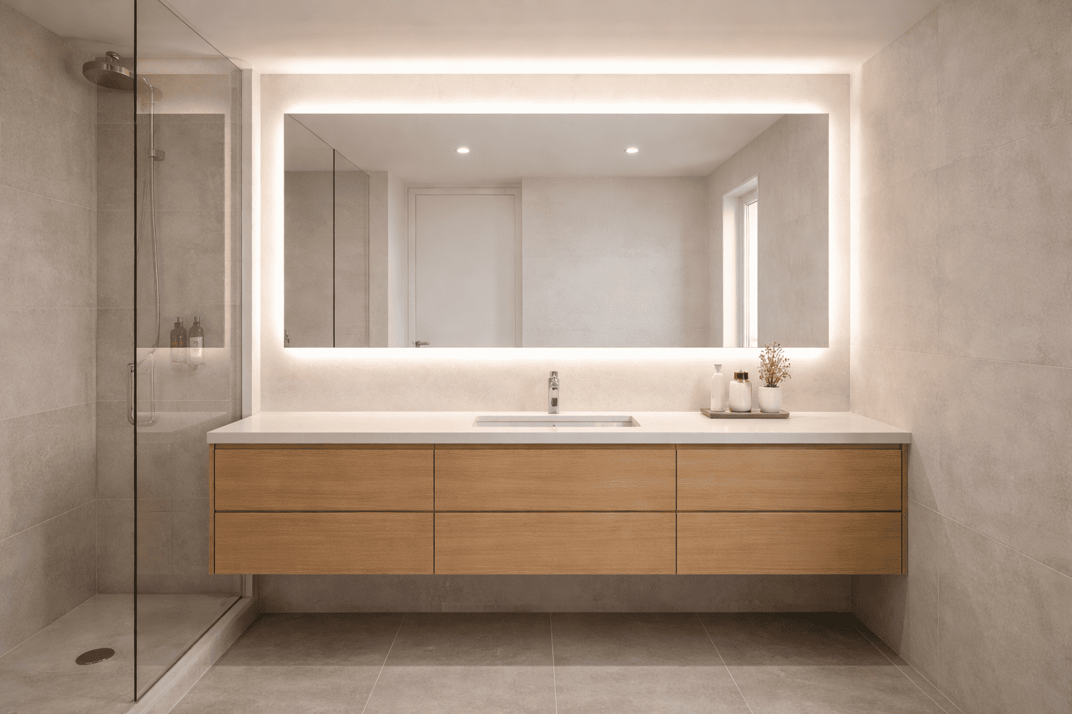 Если низ отвечает за порядок, то верх отвечает за восприятие. Зеркало и освещение формируют то, как ванная «читается» с порога: светло или темно, уютно или слишком контрастно, выглядит ли помещение просторнее.