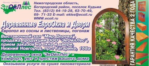 Лесной холдинг "ЭкойлЛес" занимается производством деревянных евроокон со стеклопакетами различных типов. Полный цикл производства, начиная от распиловки бревна до готового окна, позволяет осуществлять сквозной контроль качества. Рама и створки окон и балконных дверей изготовлены из клееного бруса произведенного по современной технологии и из сибирской сосны и лиственницы радиального распила, что обеспечивает отсутствие деформаций в конструкциях и их долговечнось. Пиломатериал высших сортов обладает высокой прочностью и просто приятной глазу текстурой древесины.