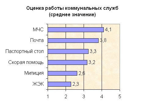 (4,1 по 5-ти балльной шкале) несмотря на то, что относительно редко пользуются ее услугами. Скорее всего это связано с широким освещением работы МЧС в средствах массовой информации. Самую низкую оценку получили работники коммунальных служб. Примечательно, что с такой оценкой согласны все нижегородцы независимо от своего материального положения, возраста и пола.