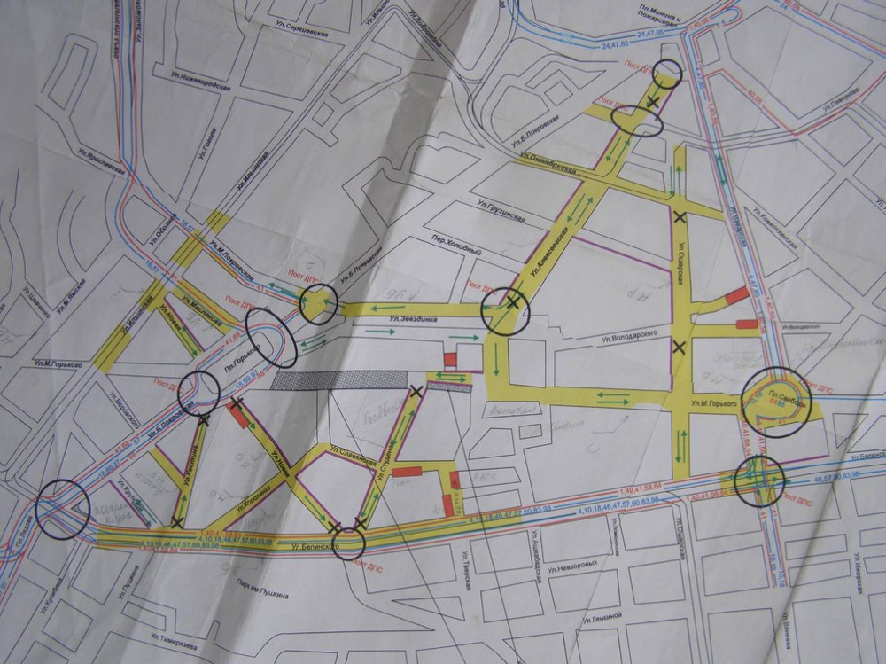 На сквозных улицах, примыкающих к улице Горького, будут дежурить десять нарядов ГИБДД. Также посты ГИБДД будут работать на площадях Лядова и Горького, на пересечениях улицы Белинского с улицами Студеной и Ванеева, а также на площади Минина Пожарского и площади Свободы.