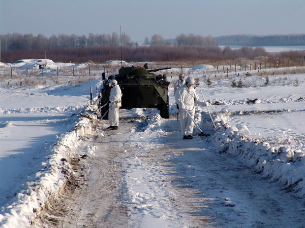 Группа саперов сопровождает БТР