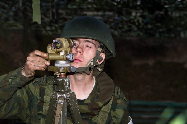 Военнослужащий, используя лазерный прибор разведки (ЛПР), определяет координаты наземных целей