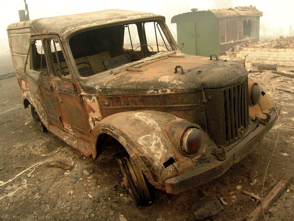 Техника, которая боролась с пожаром, сама сгорела в огне. с. Верхняя Верея. Фото на следующий день после пожара