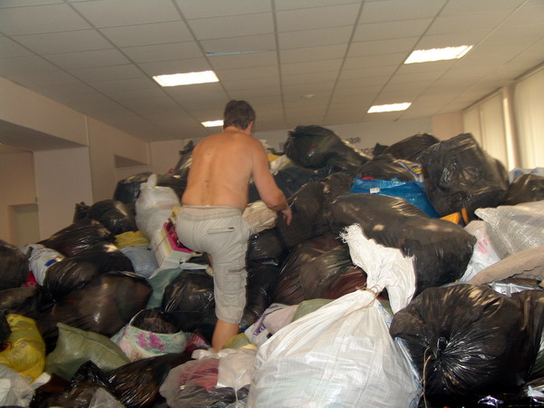 Специалисты министерства социальной политики Нижегородской области сортируют гуманитарную помощь