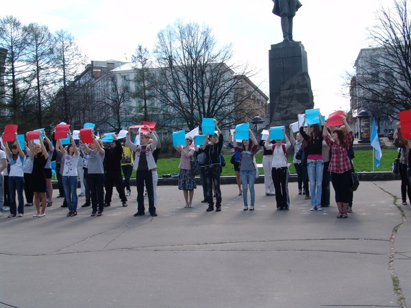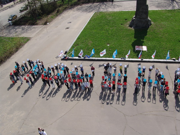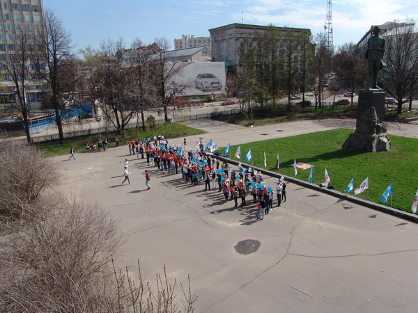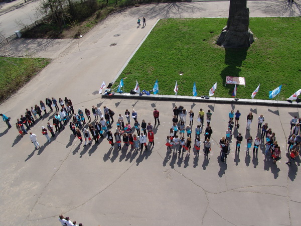 Активисты "Молодой гвардии Единой России" и движения "Сталь" образовали своими телами слово "Победа" на пл. Горького в Нижнем Новгороде
