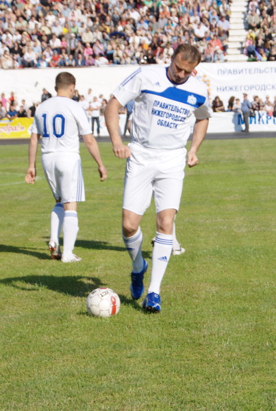 Министр строительства Нижегородской области Владимир Челомин пробивает штрафной