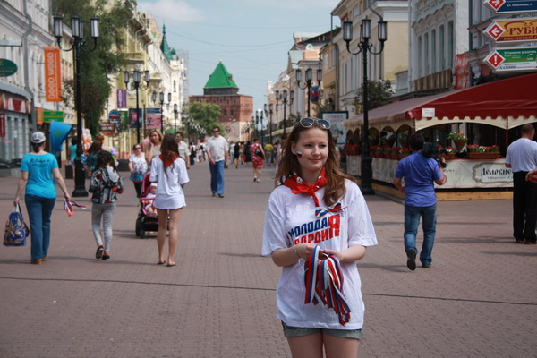 Активисты раздают прохожим ленты, выполненные в виде российского флага