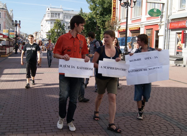 Около 10 человек активистов собрались у статуи козы на улице Большая Покровская Нижнего Новгорода 26 июня около 09:00. В руках они держали плакаты с надписями: "Мы идем за батоном – а мэрия против", "Больше трех – за батоном не ходить!!!". Сотрудников полиции на месте встречи активистов видно не было. Купленный без согласия руководства города батон активисты "Левого фронта" вручили работнику администрации Нижнего Новгорода Валерию Петянину.