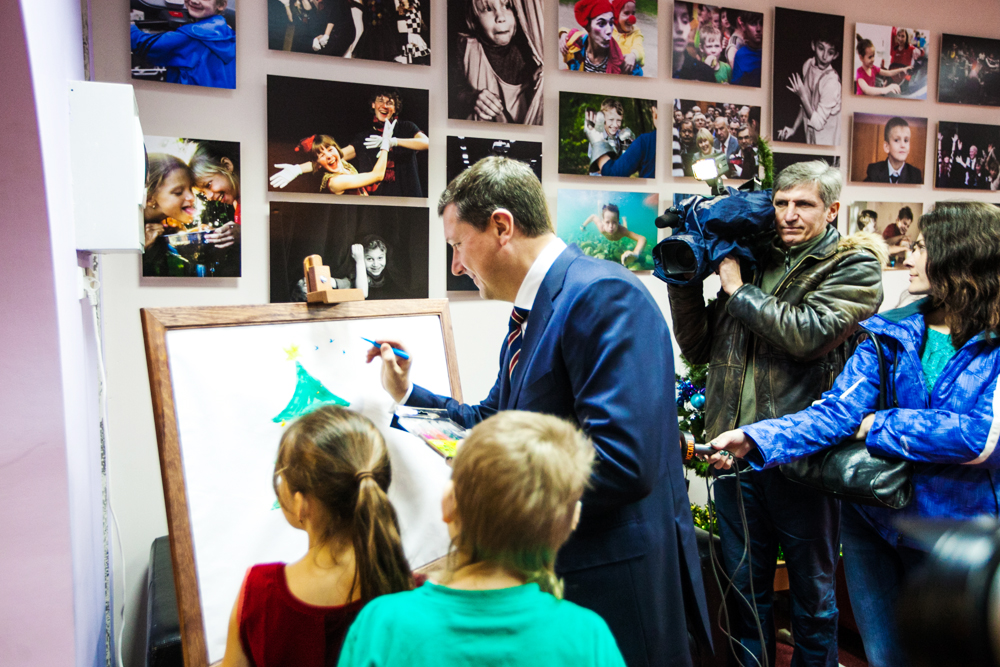 Сорокин вручил юным артистам подарки, которые были куплены по их заказу: наборы карандашей, красок и фломастеров. Рисование для слабослышащих ребят – одна из форм реабилитации, поэтому им разрешают творить прямо на стенах. Подключился к процессу и глава города – на одной из картин он нарисовал снежинки.