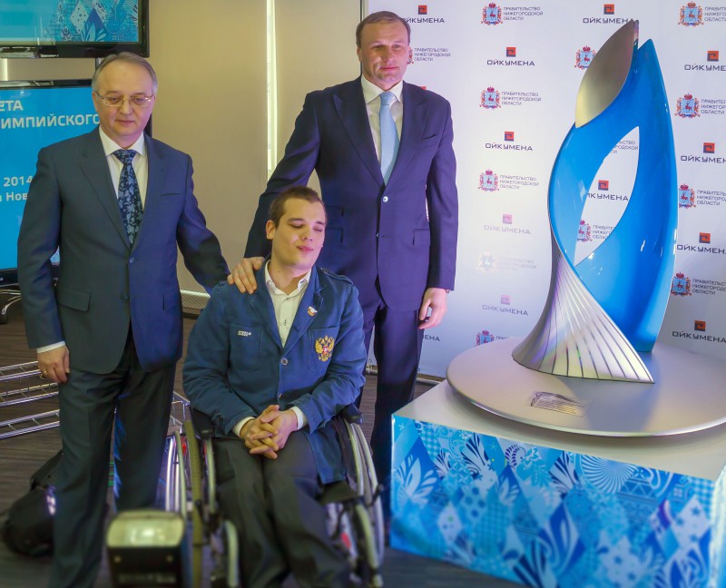 В рамках пресс-конференции состоялась передача Чаши Паралимпийского огня городу. Генеральный директор строительной компании ООО “Ойкумена-Нижний Новгород” - Роман Мирошников вручил символ зимней Паралимпиады заместителю губернатора Нижегородской области Дмитрию Сватковскому.