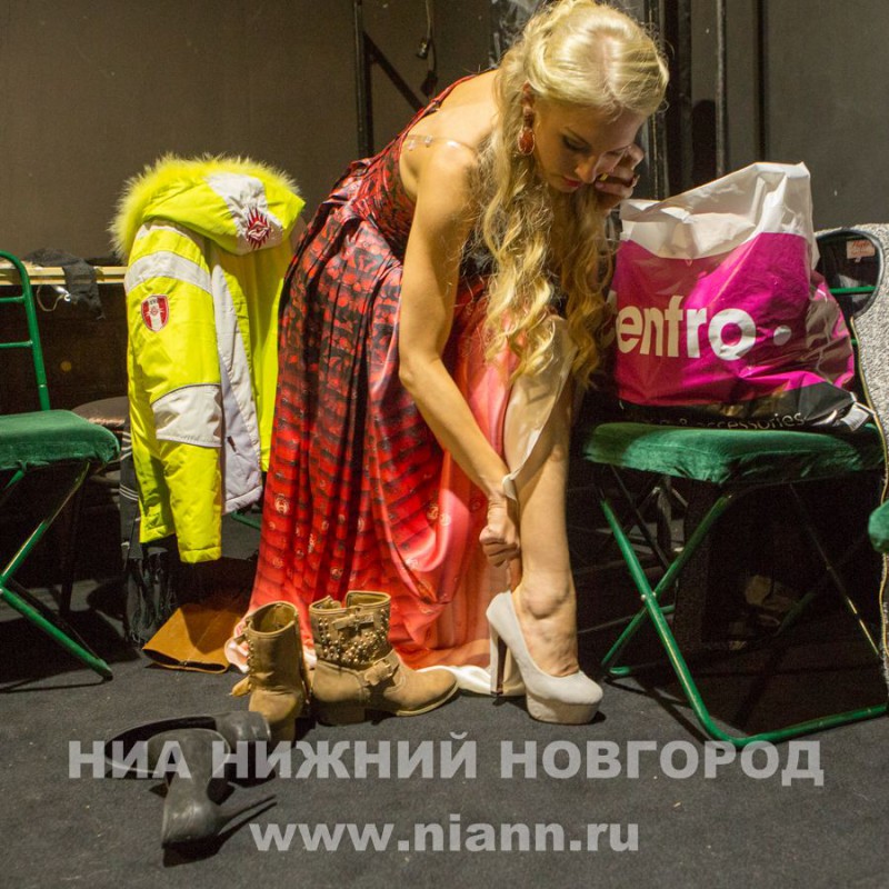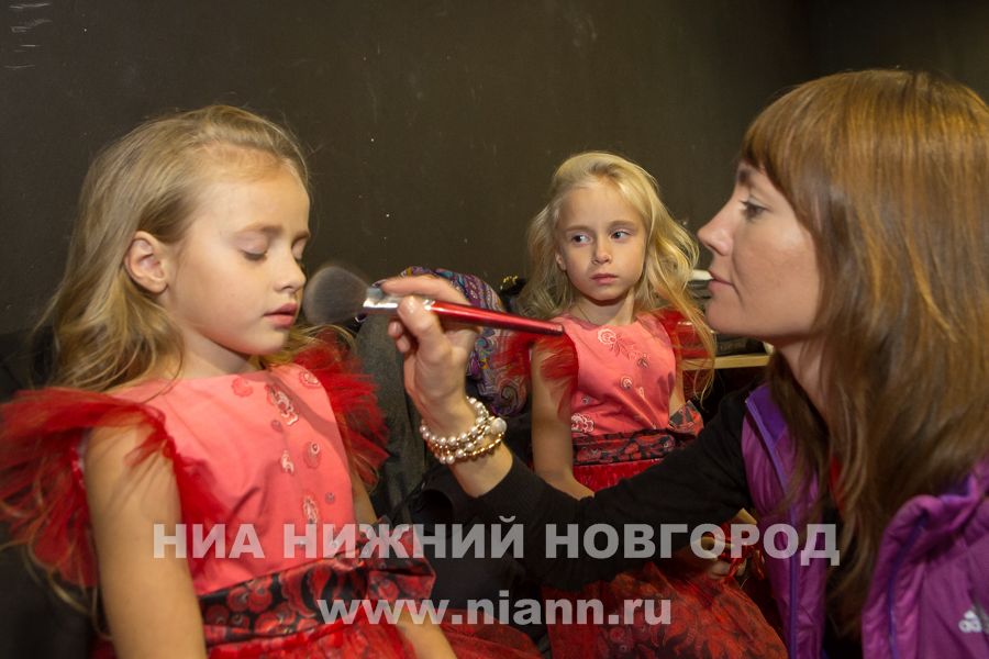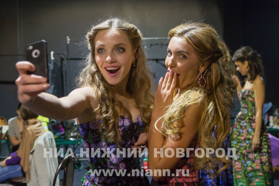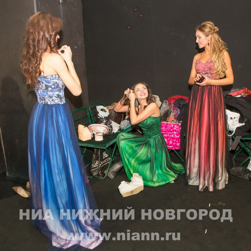 Участницы конкурса красоты готовятся ко второму выходу - дефиле в вечерних платьях с узорами в стиле городецкой и хохломской росписи из новой коллекции Иволга