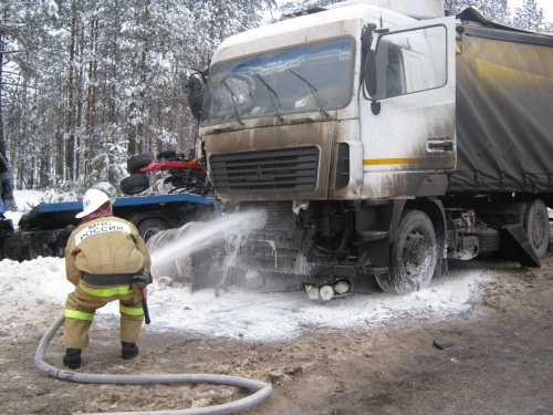 В результате ДТП водитель МАЗа скончался на месте происшествия. Водитель второго автомобиля не пострадал. На месте происшествия работают сотрудники ГИБДД.