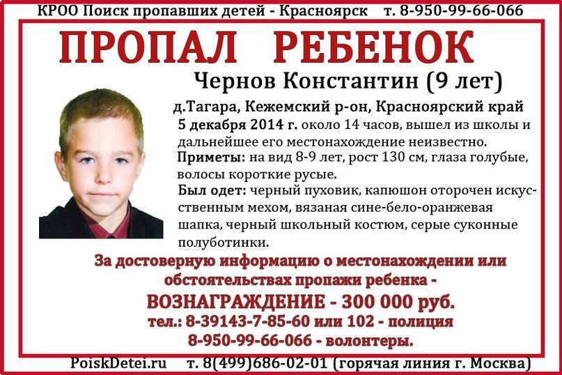 Согласно информации, девятилетний Константин Чернов из д. Тагара Кежемского района Красноярского края 5 декабря 2014 года около 14:00 вышел из школы и с тех пор о его местонахождении ничего не известно. Сообщается, что ребенок может находиться в любом городе.
