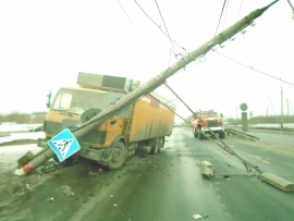 В результате ДТП столб упал на проезжую часть и перекрыл трассу М7. Известно, что на одном участке в данном месте движение двухполосное и не имеет объезда.
