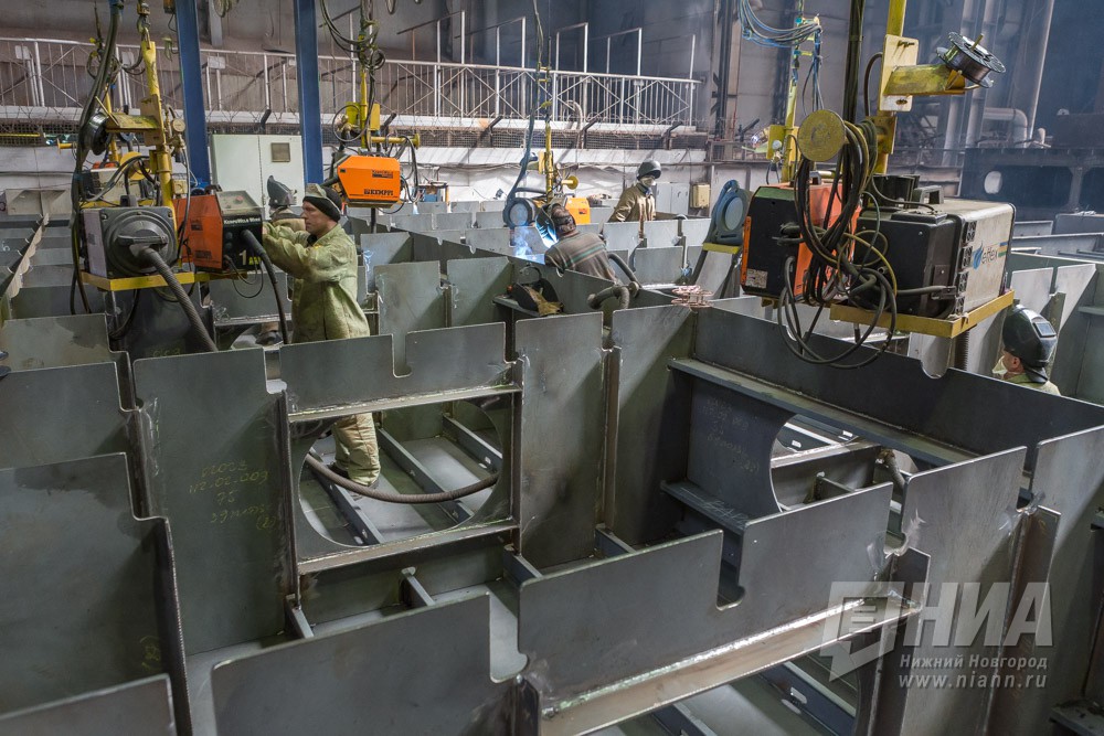 Полномочный представитель Президента РФ в ПФО Михаил Бабич, генеральный директор ОАО Завод Красное Сормово Николай Жарков в сборочно-сварочном цехе завода Красное Сормово