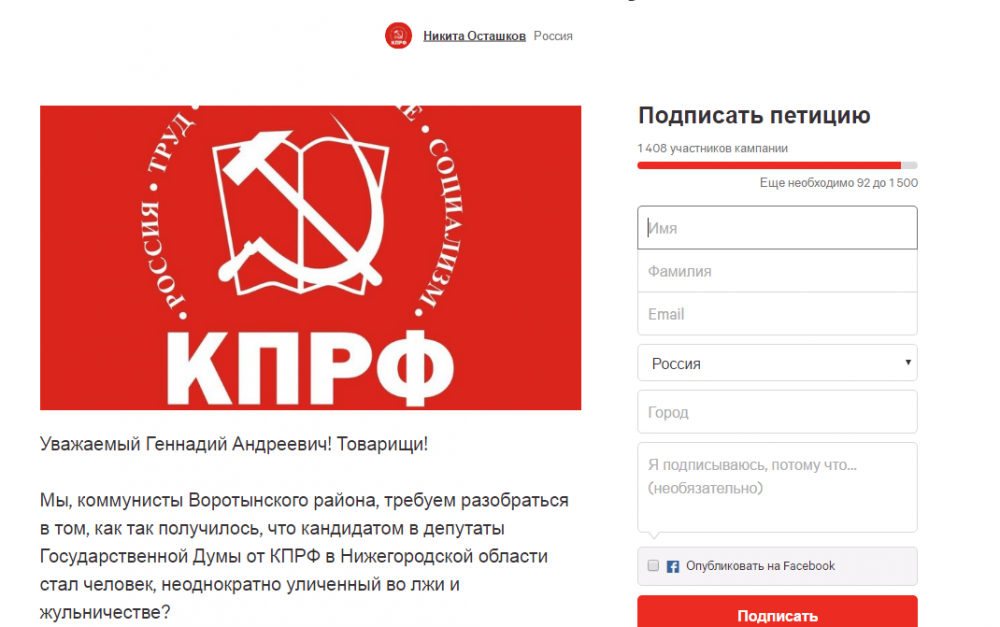 Петиция опубликована на сайте change.org от имени Никиты Осташкова в начале июля 2016 года. В тексте петиции, адресованной ЦК КПРФ,