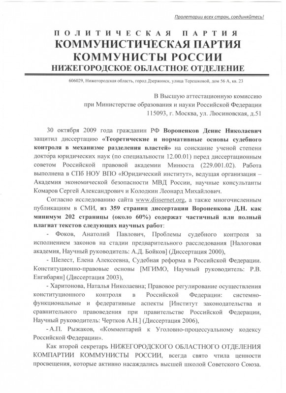 Второй секретарь НРО "Коммунисты России" в своем обращении в высшую аттестационную комиссию при Министерстве образования и науки РФ напоминает, что диссертацию "Теоретические и нормативные основы судебного контроля в механизме разделения властей" на соискание ученой степени доктора юридических наук Денис Вороненков защитил 30 октября 2009 года.