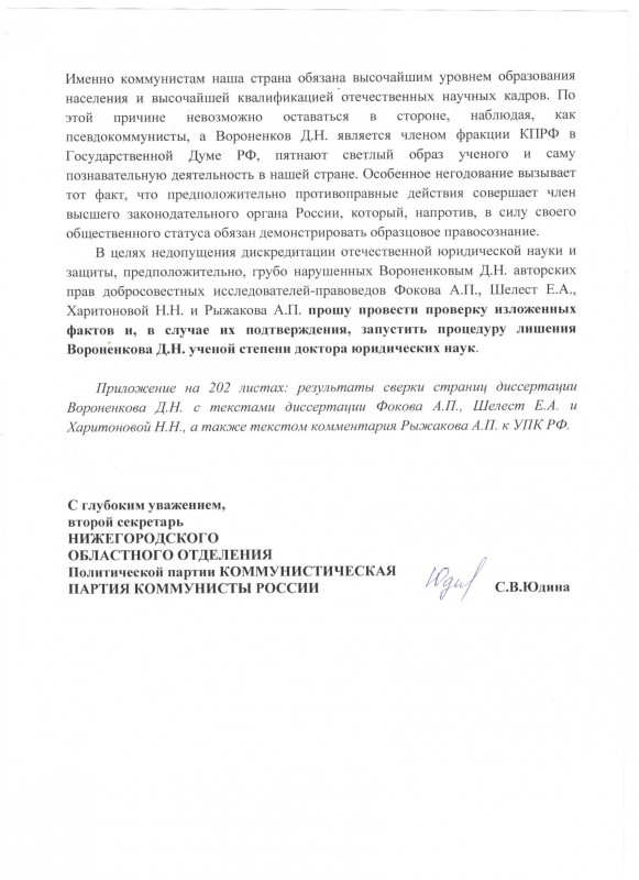 НРО "Коммунисты России" требуют лишить депутата Государственной Думы от КПРФ Дениса Вороненкова ученой степени. Официальное письмо за подписью второго секретаря НРО "Коммунисты России" Светланы Юдиной размещено на сайте партии 24 июля 2016 года.