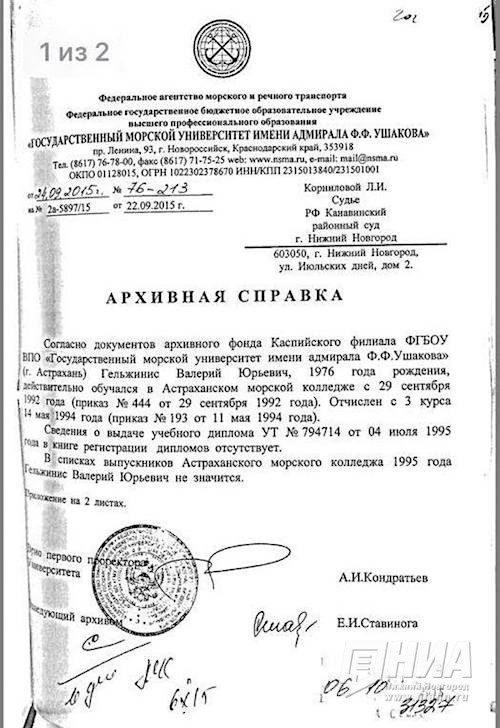 В 2015 году во время предвыборной кампании в городскую Думу Нижнего Новгорода в Канавинском районном суде оспаривалась регистрация Гельжиниса кандидатом в депутаты. У заявителя был ряд претензий к документам, поданным в избирком, в том числе к диплому об образовании (по информации, предоставленной Гельжинисом в избирком, и указанной в справке на сайте Гордумы, он окончил Астраханский морской колледж) – нынешнее наименование учебного заведения отличается от наименования, указанного в дипломе. По всем претензиям суд заявителю отказал, так как в них не было выявлено нарушений избирательного законодательства. Однако через месяц после вынесения решения суда (решение было вынесено 21 августа) поступил ответ из учебного заведения, касающийся диплома Гельжиниса. В ответе сказано (текст имеется в распоряжении редакции), что диплом он не получал, так как был отчислен с третьего курса, и что сведения о выдаче ему диплома в книге регистрации отсутствуют.