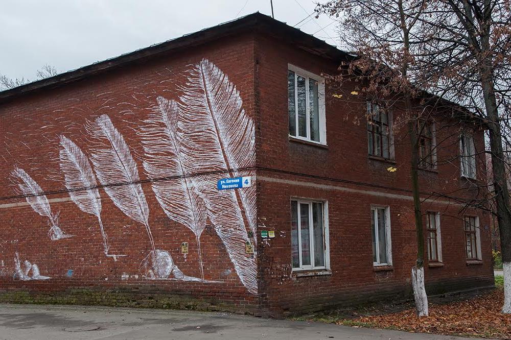 С третьим объектом работал нижегородский художник Антон Мороков, который в октябре создал монументальную работу на доме по адресу: ул. Евгения Никонова, 4. Этот дом был построен для рабочих машиностроительного завода в 1929 году. Ранее целый исторический Калининский поселок был застроен такими домами – теперь их постепенно расселяют и сносят. Художник решил запечатлеть процесс течения времени, изобразив лес из белоснежных перьев, символизирующий цикличность жизни со свойственными ей переменами.