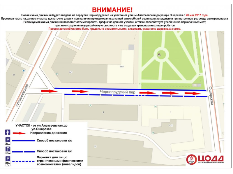 Согласно информации, движение по указанному переулку будет односторонним в сторону ул. Ошарской.