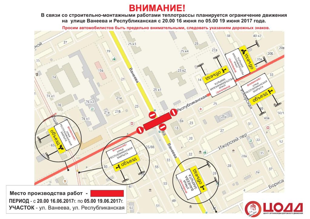 Также с 20:00 16 июня по 05:00 19 июня ремонтные работы будут вестись на перекрёстке ул. Ванеева и ул.Республиканская. При этом ул. Республиканская будет закрыта с 08:00 13 июня по 17:00 25 июня. Ограничения вводятся в связи со строительно-монтажными работами теплотрассы.