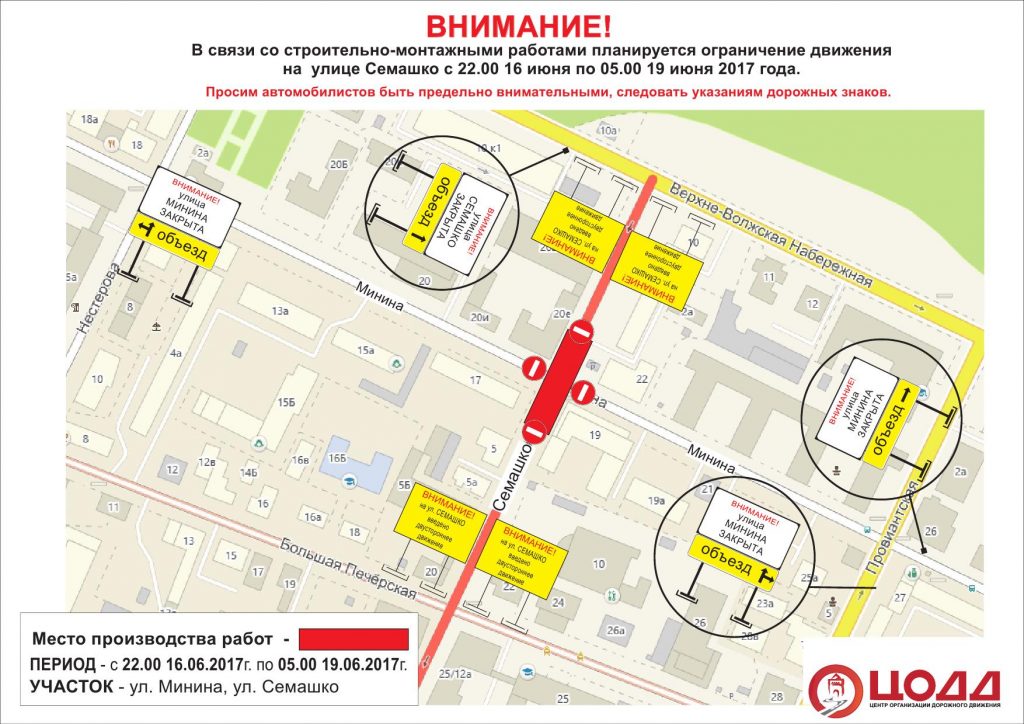 Перекрёсток ул.Минина и ул.Семашко будет закрыт в связи со строительно-монтажными работами также с 22:00 16 июня по 05:00 19 июня. Кроме того, движение по ул. Семашко будет закрыто с 08:00 14 июня по 17:00 25 июня.