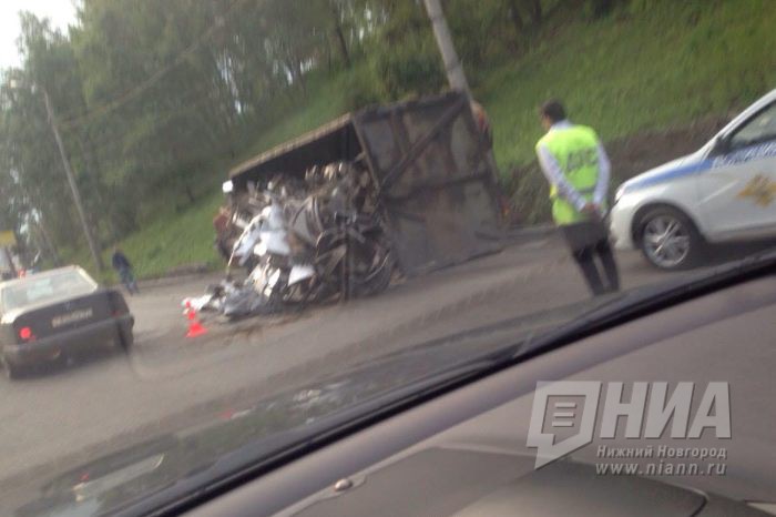 Мусоровоз перевернулся на подходе к Мызинскому мосту в Нижнем Новгороде 3 июля 2017 года. Об этом сообщил очевидец ДТП.