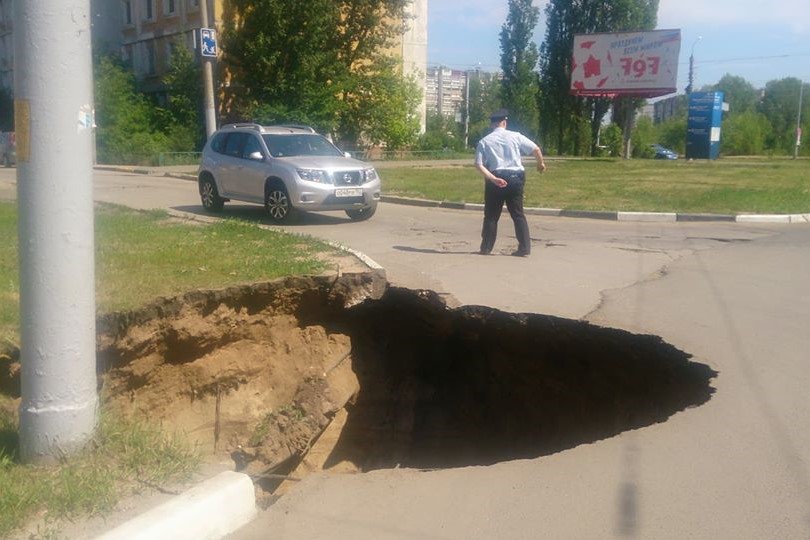 Провал асфальта произошел в микрорайоне Мещерское озеро в Нижнем Новгороде. Об этом сообщили очевидцы в соцсети Facebook 25 июня 2018 года.