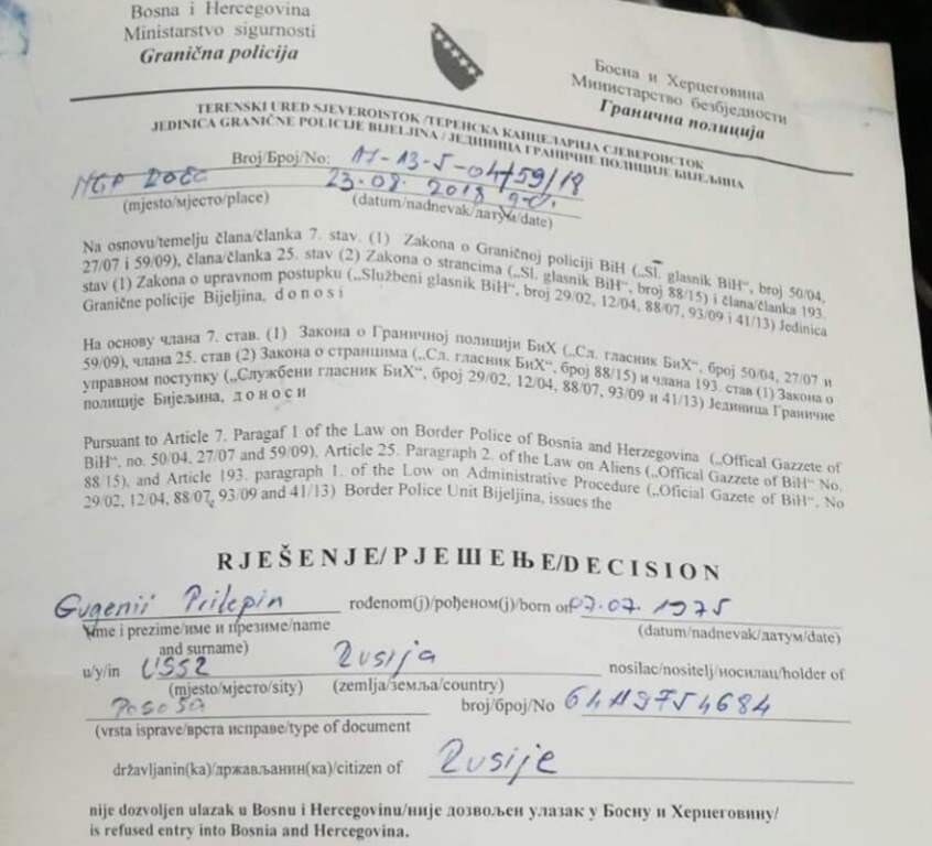 Согласно информации, основанием послужил официальный документ министерства безопасности республики, который с 26 марта 2018 года запрещает Евгению Прилепину (Захар Прилепин - псевдоним; прим. ред. НИА-НН) въезд на территорию Боснии и Герцоговины.