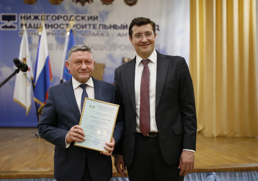 Глава региона Глеб Никитин вручил сертификаты с номерами 0001 и 0002 ПАО Нижегородский машиностроительный завод и АО Нижегородский завод 70-летия Победыгенеральному директору предприятий Василию Шупранову.