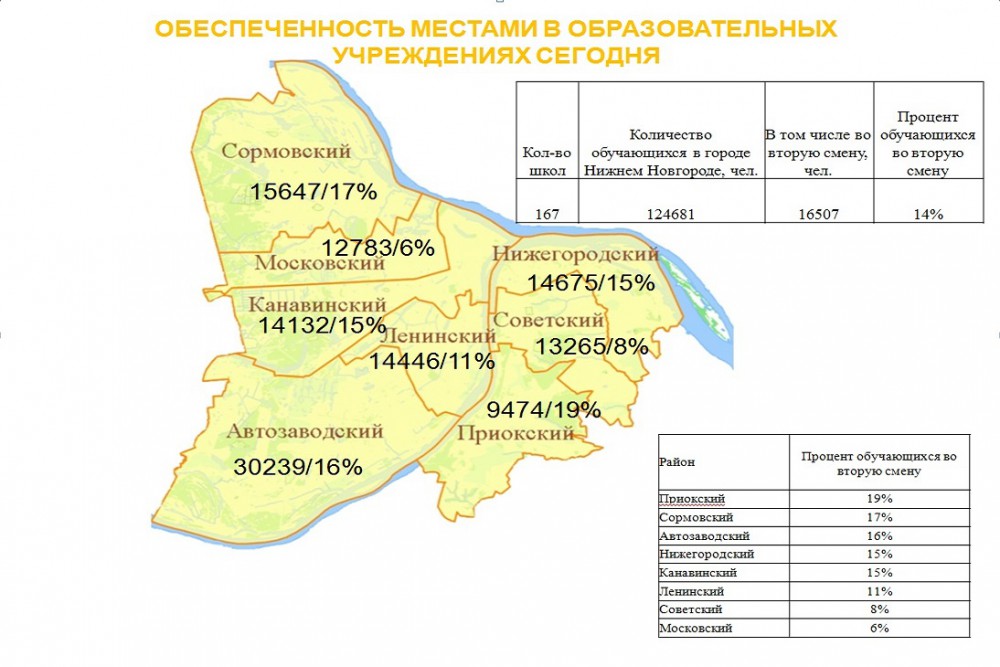 "Мы проверили обеспеченность местами в образовательных учреждениях в целом по городу и по каждому району. Во вторую смену сейчас учится 14% нижегородских школьников, это 16,5 тысяч человек. Если говорить в целом о задачах федеральной программы, в которую мы вошли, – это ликвидация второй смены в полном объеме", – добавила Казачкова.