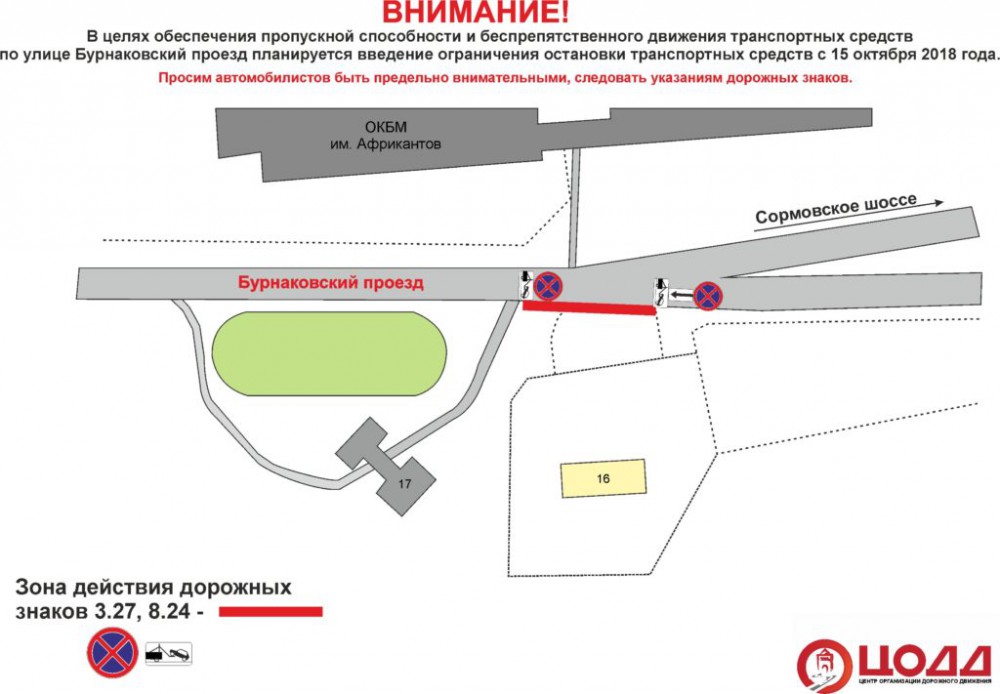 Согласно информации, с 15 октября на Бурнаковском проезде напротив дома №16, где расположен приют для животных организации "Сострадание-НН", планируется ввести ограничение остановки личного транспорта. В этом месте будут установлены дорожные знаки 3.27 "Остановка запрещена" и 8.24 "Работает эвакуатор".