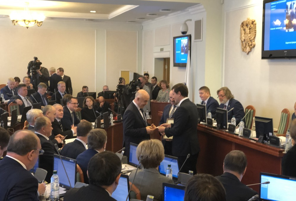 Дипломы новым почетным гражданам региона вручил председатель Законодательного собрания Евгений Лебедев.