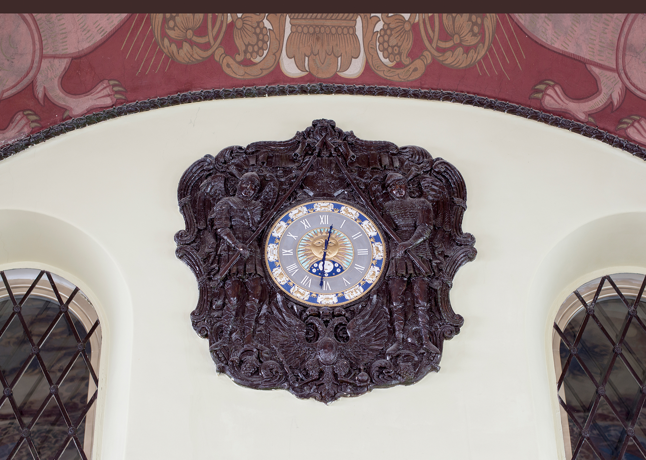 Для росписей выбирались традиционные для русской культуры сюжеты. Это астрологические знаки, лики солнца и луны, времена года. Только одна роспись тематически связана с банком. Это изображение четырех фигур, которые символизируют металлы, из которых чеканились монеты: медь, серебро, золото и платина.