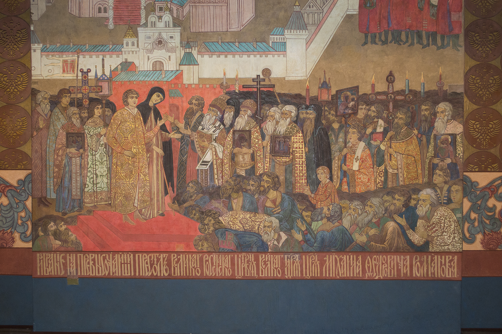 Фресковая роспись этого зала посвящалась избранию царя Михаила Федоровича Романова, богатству России, подвигу Нижегородского ополчения начала 17 века и выдающейся роли нижегородцев в истории страны.