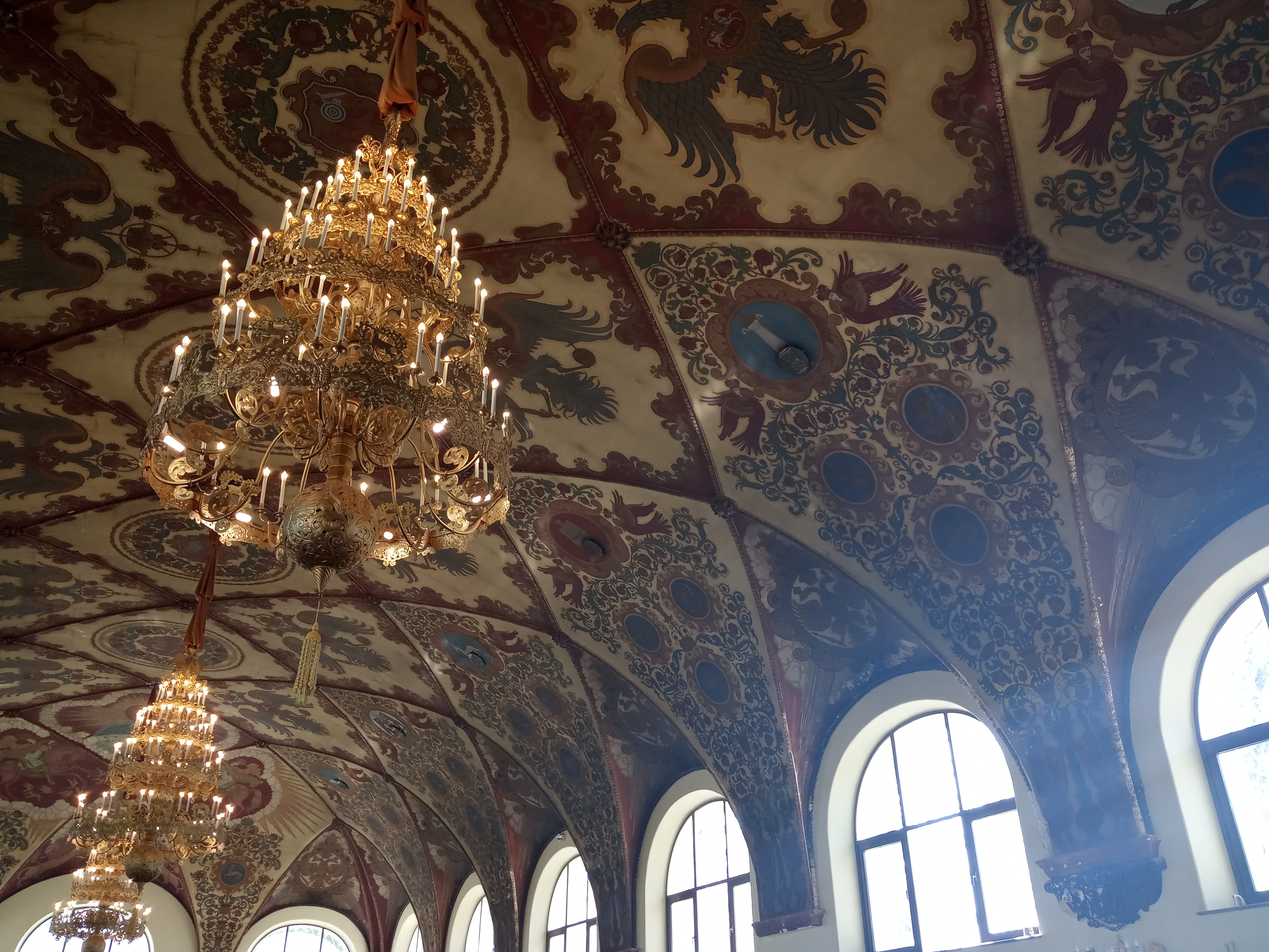Росписи никогда не реставрировались и сохранились без изменений. Еще более величественным потолок делают люстры весом более полутонны, изготовленные в Санкт-Петербургском арматурно-электрическом обществе.