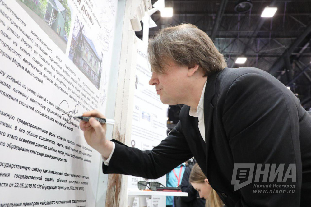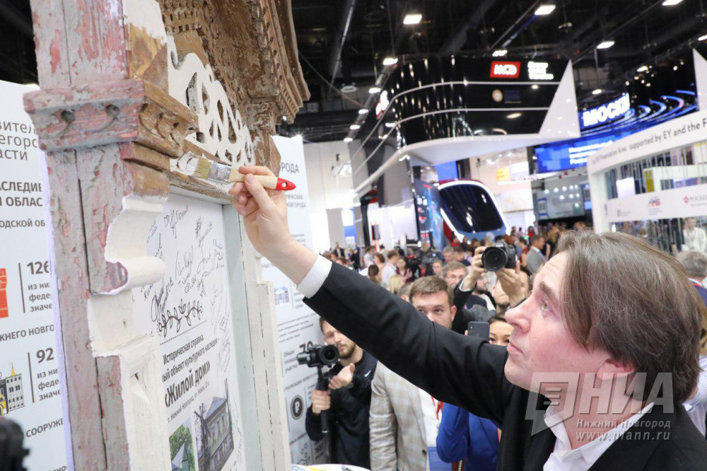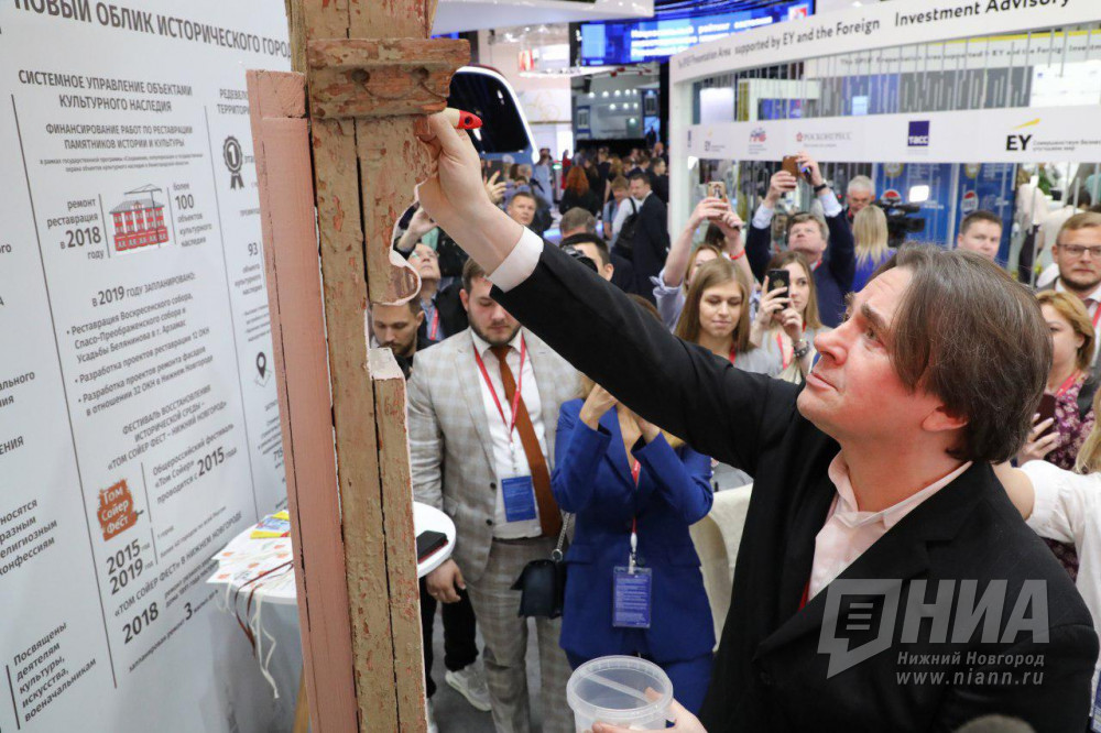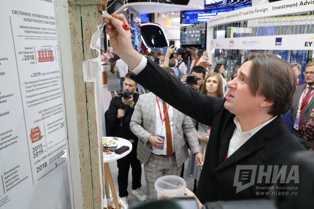 Константин Эрнст и Тина Канделаки приняли участие в акции по покраске резного наличника одного из реконструируемых в рамках фестиваля "Том Сойер Фест - Нижний Новгород" домов - д.22а по ул.Новая. Это выявленный объект культурного наследия, расположенный в районе церкви Трех Святителей. После форума наличник будет перевезен обратно в Нижний Новгород.