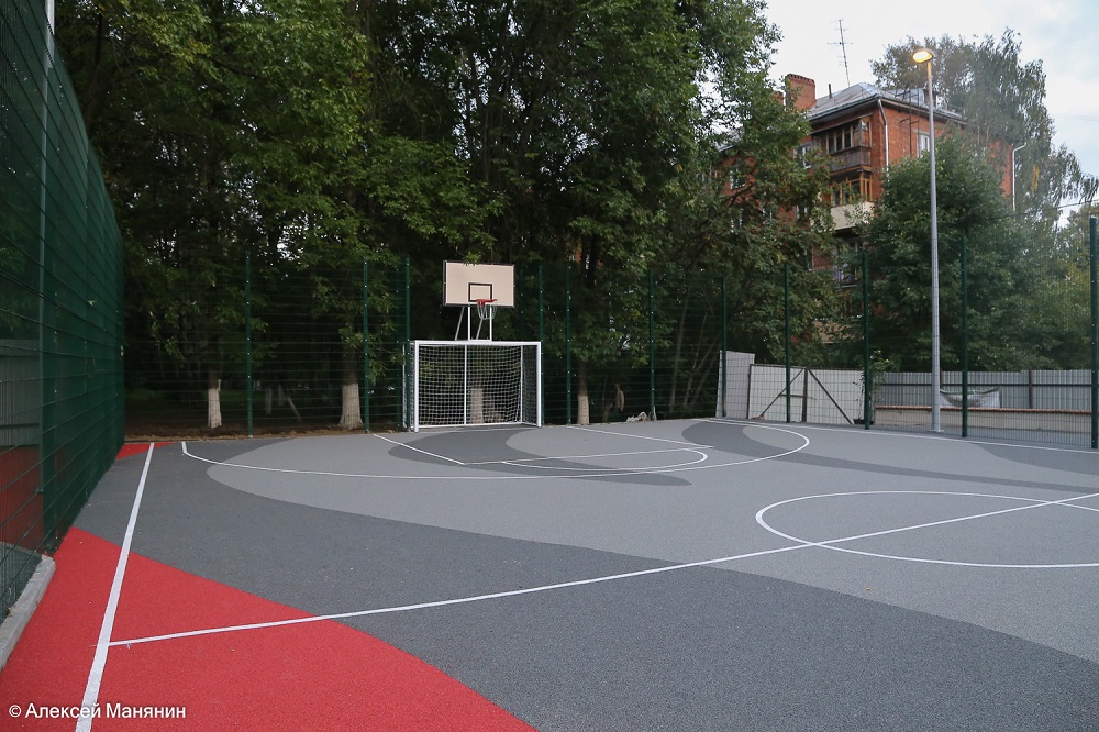Качели, карусели и другие детские игровые элементы стоят на особом покрытии из деревянных опилок – для удобства и безопасности детей; также есть зеленая зона со скамейками и шахматными столиками. Третья зона – спортивная – включает в себя поле для минифутбола с баскетболом и разнообразные тренажеры.